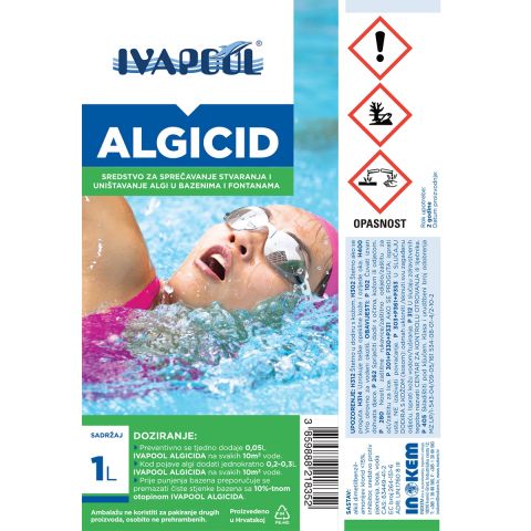 IVAPOOL Algicid je koncentrirano sredstvo za uništavanje svih tipova algi. Ne pjeni se te je pogodan za upotrebu u bazenima s dodatnom cirkulacijom vode poput hidromasažnih kada, fontana i sl. Potpuno je topiv u vodi i pH je neutralan.
