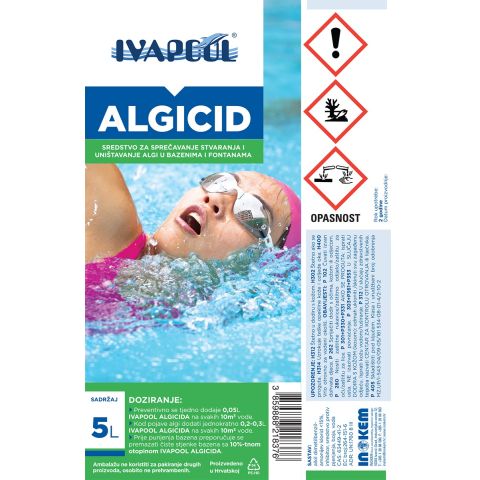 IVAPOOL Algicid je koncentrirano sredstvo za uništavanje svih tipova algi. Ne pjeni se te je pogodan za upotrebu u bazenima s dodatnom cirkulacijom vode poput hidromasažnih kada, fontana i sl. Potpuno je topiv u vodi i pH je neutralan.
