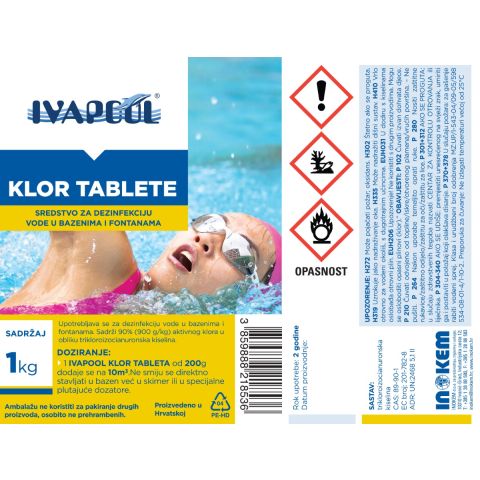 IVAPOOL Klor tablete - dezinficijens u obliku tableta od 200 g sa 90% aktivnog klora. Pogodne su za redovno kloriranje.