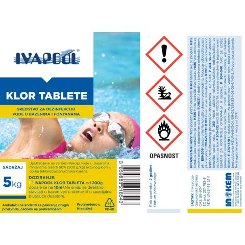 IVAPOOL Klor tablete - dezinficijens u obliku tableta od 200 g sa 90% aktivnog klora. Pogodne su za redovno kloriranje.