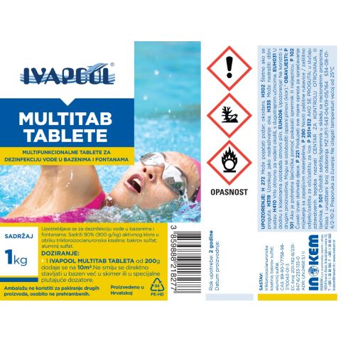 IVAPOOL Multitab tablete su klorno dezinfekcijsko sredstvo na bazi triklorizocijanurne kiseline sa sadržajem 90% aktivnog klora, ugrađenim stabilizatorom klora te s dodanim algicidom i flokulantom.