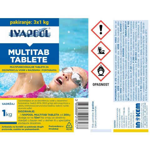 IVAPOOL Multitab tablete su klorno dezinfekcijsko sredstvo na bazi triklorizocijanurne kiseline sa sadržajem 90% aktivnog klora, ugrađenim stabilizatorom klora te s dodanim algicidom i flokulantom.