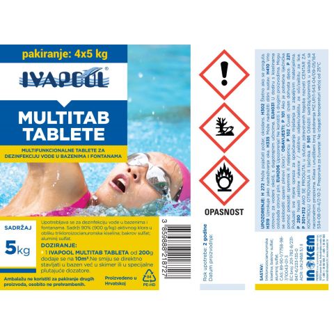 IVAPOOL Multitab tablete su klorno dezinfekcijsko sredstvo na bazi triklorizocijanurne kiseline sa sadržajem 90% aktivnog klora, ugrađenim stabilizatorom klora te s dodanim algicidom i flokulantom.