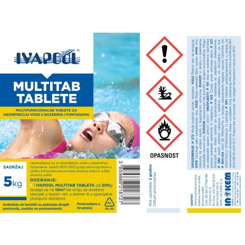 IVAPOOL Multitab tablete su klorno dezinfekcijsko sredstvo na bazi triklorizocijanurne kiseline sa sadržajem 90% aktivnog klora, ugrađenim stabilizatorom klora te s dodanim algicidom i flokulantom.