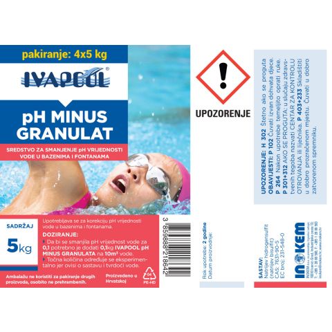- za smanjenje pH vrijednosti vode za 0,1 potrebno je dodati cca 0,1 kg IVAPOOL pH minus granulata na 10m³ vode - točna količina određuje se ekspirimentalno jer ovisi o tvrdoći i sastavu vode